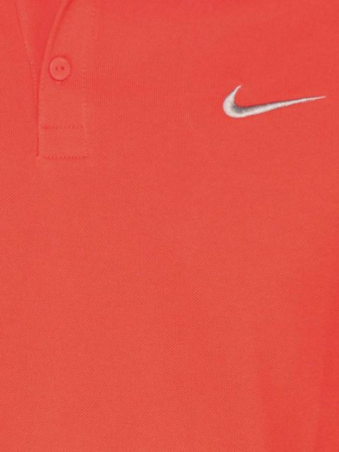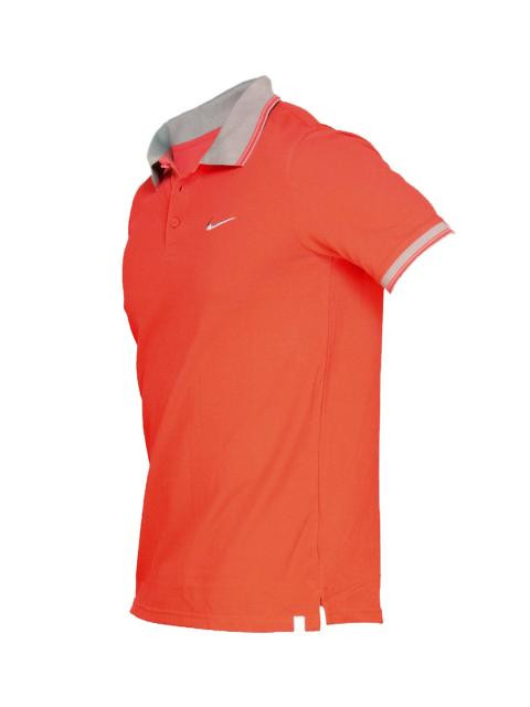 Orange Dri-Fit polyester t-shirt, with a grey collar, front button placket and nike heat transfer swoosh