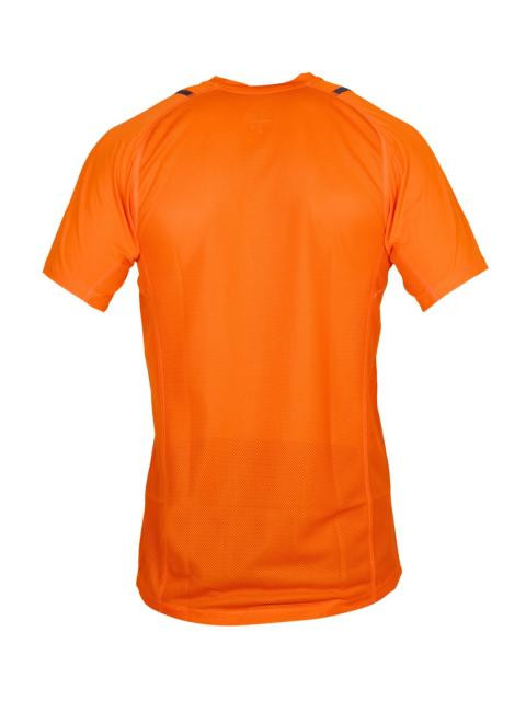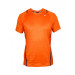 Orange round neck short sleeved t-shirt made of 100% recycled polyester, with a mesh back, engineered with Dri-Fit technology, has dark orange polka dots and a black stripe along the sides and brand logo in grey on left chest