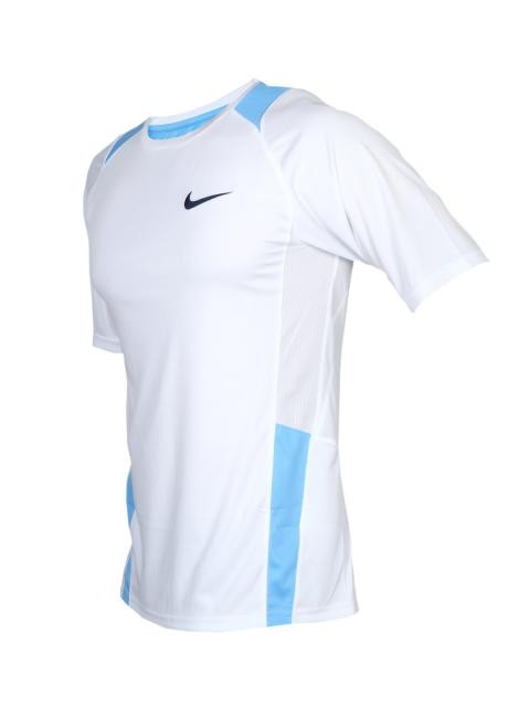 At the gym, on the beach or simply enjoying those healthy runs, there's no better way to do it than in this nike t-shirt. Smart to look at, and engineered with Dry-Fit technology to ensure you stay dry and fresh all day, there's nothing better an active man can ask for. The blue panels add a dash of summery color to this white tee. Pair it with track pants or shorts and sports shoes to complete that uber cool look.