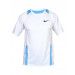 White round neck short sleeved t-shirt with contoured panels, made of 100% polyester with Dry-Fit technology, has a mesh back, blue panels on the shoulders and brand logo in black on left chest