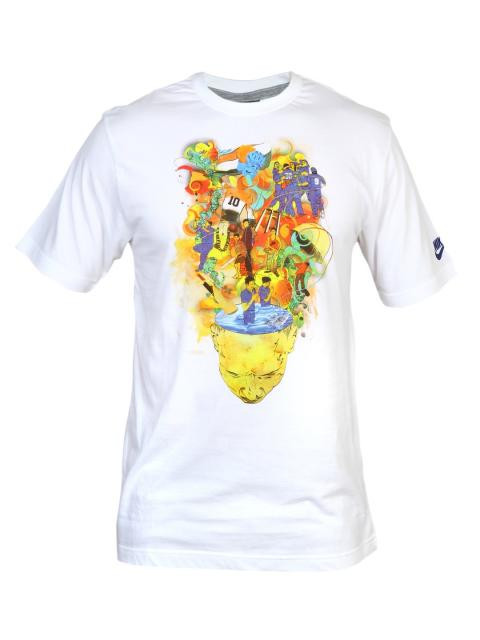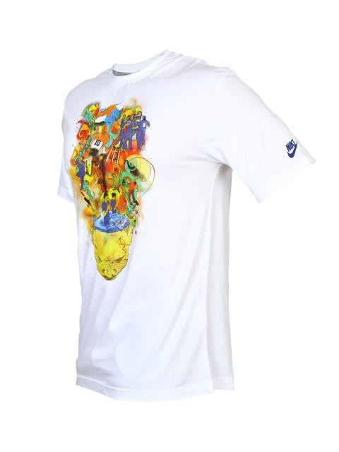 White round neck t-shirt made of 100% cotton, with chest print, ribbing around the inner neck, and nike swoosh on the left sleeve