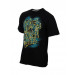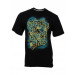 Black crew neck t-shirt made of 100% cotton, with short sleeves, fabric tape on inseam of the neckline, and has a graphic print