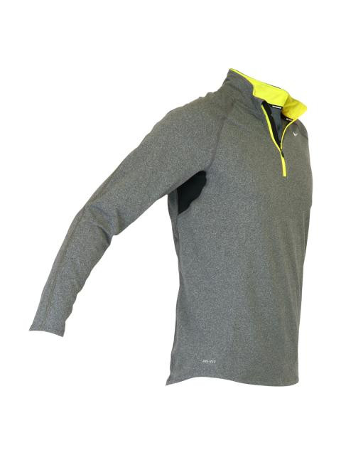 Grey melange T-shirt made of 88% polyester and 12% spandex, that has mock neck with neon yellow tape detailing on the inseam, neon yellow zippered chest placket, long raglan sleeves, black mesh inserts on the arm pit area ,swoosh logo embossed on the upper left chest and reflector strips on the sleeves