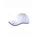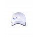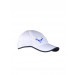 White featherlight tennis cap made of 100% polyester, nike Swoosh embroidered on visor, Bull logo embroidered on crown, Velcro fastener at the back, recycled content used in manufacturing, and engineered with Dri-Fit technology