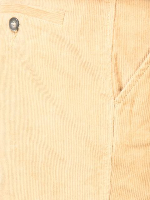 Khaki corduroy trouser made of 100% cotton, has a flat front, pockets on the front with a patch pocket above the right one, two pockets at the back, looped waist, and a zipper and button closure on the front
