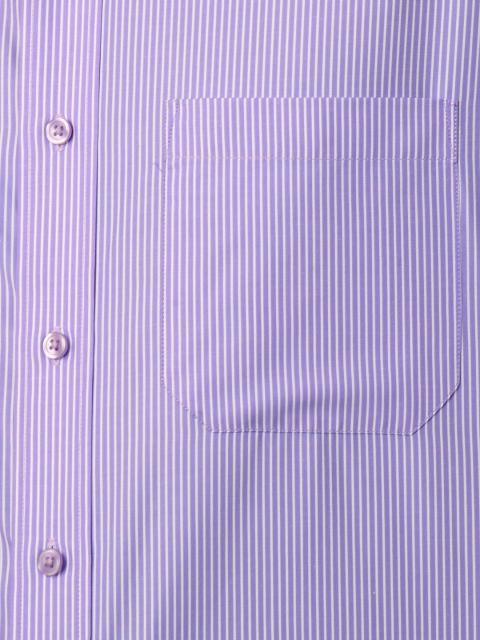 Lavender and white striped shirt made of blended cotton, has a spread collar, long sleeves with buttoned cuffs, full buttoned placket, a patch pocket on the left chest and a curved hem