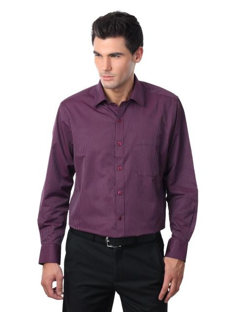 Purple striped shirt, made of blended cotton, has a spread collar, long sleeves with buttoned cuffs, full buttoned placket, a patch pocket on the left chest and a curved hem