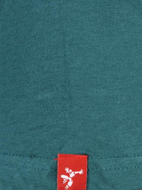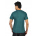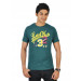 Bottle green round neck t-shirt in 100% cotton, has short sleeves, fabric tape detailing on the inseam of the collar, and with rubber print and screen print on the chest