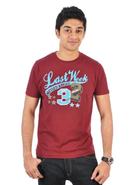 Maroon round neck t-shirt in 100% cotton, has short sleeves, fabric tape detailing on the inseam of the collar, and with rubber print and screen print on the chest