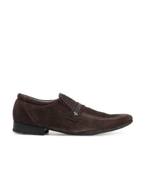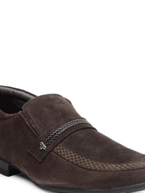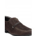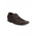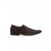 Brown round toed-slip on shoe, has a mid-foot strap adhered to the upper