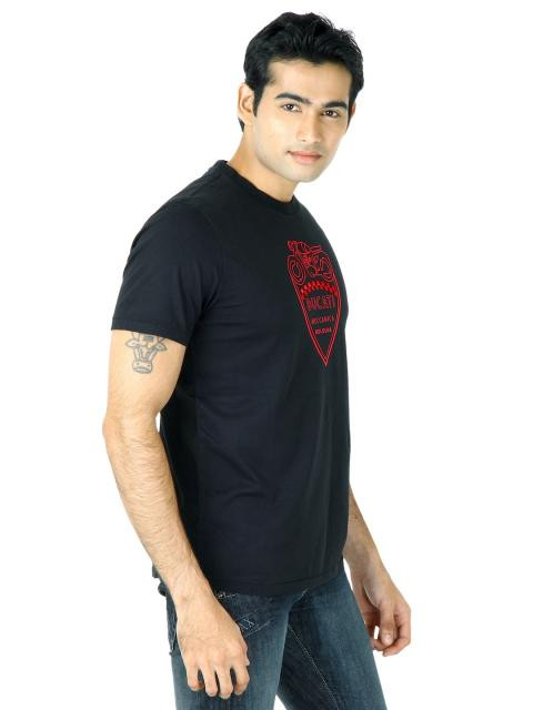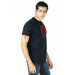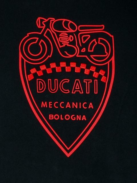 Black round neck T-shirt made of 100% cotton, has a ribbed neckline, short sleeves, embroidered cat logo on the left sleeve, Ducati print below the collar at the back and rubber print with embroidered detailing on the chest