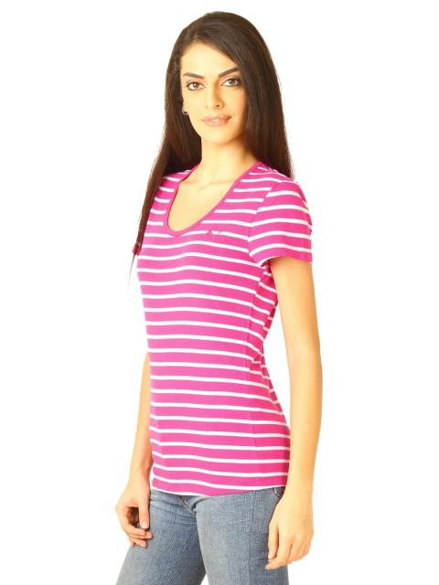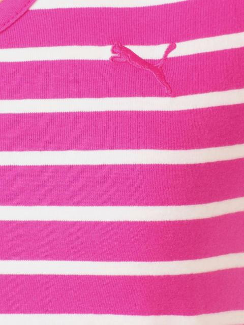 Composition White and pink striped scoop neck t-shirt made of 100% cotton with mega sleeves, blue piping around neckline, cat embroidery on the left chest and behind collar Fitting Comfort Wash Care Gentle machine wash with similar colours in cool water Use light detergent Wash and iron inside out Do not bleach, dry clean or tumble dry Warm iron Add a burst of fresh pink to your wardrobe with this blue and white striped tee from puma. Team this with white cotton pants or shorts and boat shoes for a sailor inspired look. Model's Statistics: 1. The model wears size S in t-shirts 2. Height-5.7', Chest-32", Waist-28"