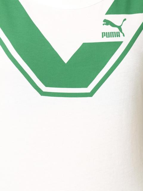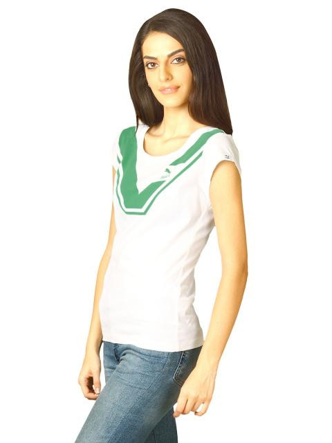 White round neck short-sleeved T-shirt, has graphic print and lettering on the front with brand name and logo on the back of the neck