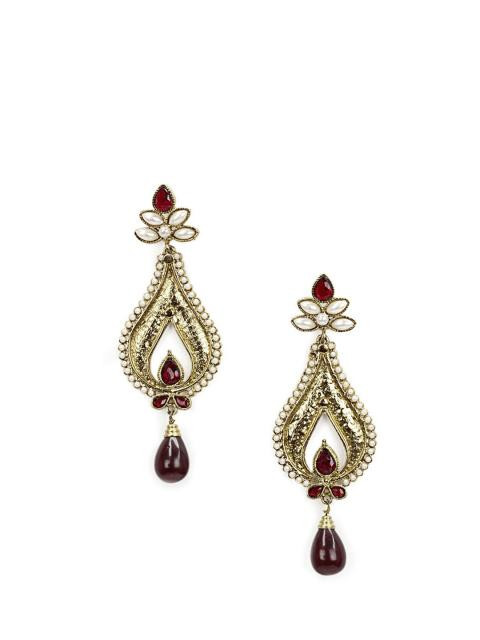 Teardrop shaped dangler with pearl like embellishments on the periphery with a maroon bead hanging from the dangler