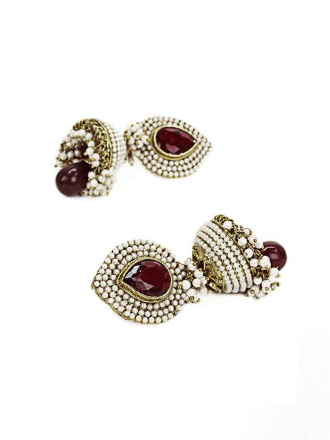A heavy jumka (a bell shaped dangler) hanging from the base with pearl embellishments