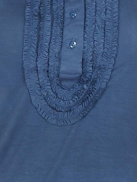 Dark blue polo neck top made of 100% viscose, has short puff sleeves with elasticated cuff, and short buttoned placket with ruffles around it