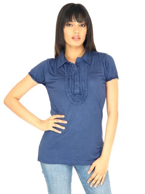 A feminine top with a formal twist, this dark blue polo neck top from scullers is a must-have in your wardrobe if you want to look pretty and in control at the same time. The girly ruffles and puff sleeves blend it perfectly with the formal-looking collar. Pair it with jeans and ballerinas for a great ensemble.
