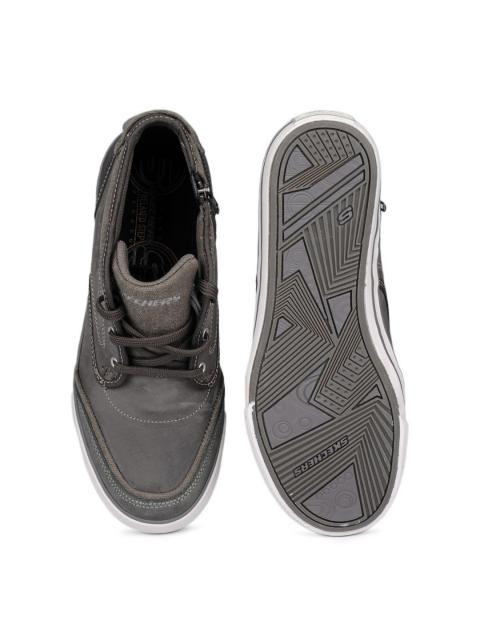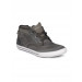 Grey mid-top leather shoes with overlays, central lace-ups, and decorative stitch detailing