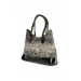 Grey and black textured handbag with branding at the base