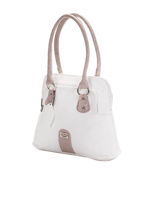 White handbag crafted from synthetic leather with two short handles with animal print for carrying ease