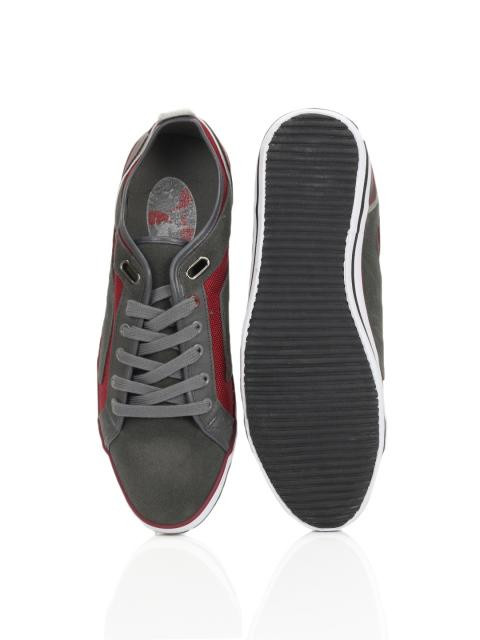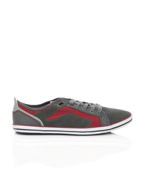 Round toed casual shoe in grey and red with lace-up fastening with thick, wax-coated laces for slip free knotting, and pull tab