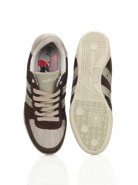Round toed casual shoe in chocolate brown and beige with a flat heel and lace-up fastening with thick, wax-coated laces for slip free knotting