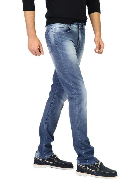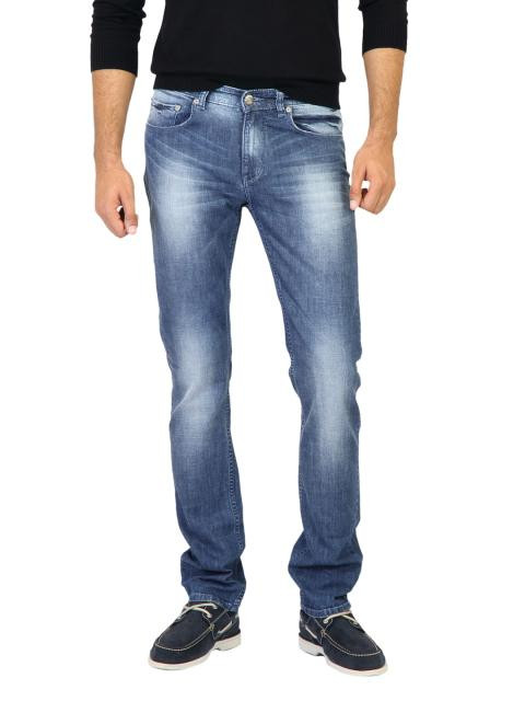 Washed blue cotton jeans, has two front pockets with a patch pocket above the right one, two patch pockets on the back with embroidered branding, creased touch, zipper fly and button closure, and belt loops on the waist