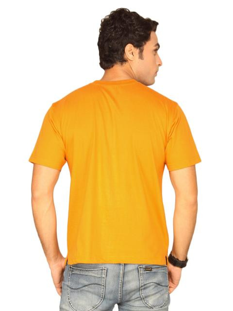 Mustard round neck short sleeved t-shirt made of 100% cotton, mustard fabric tape on the inseam of the neckline, vented hem, has graphic print on the front with a slightly distressed lookFitRegular