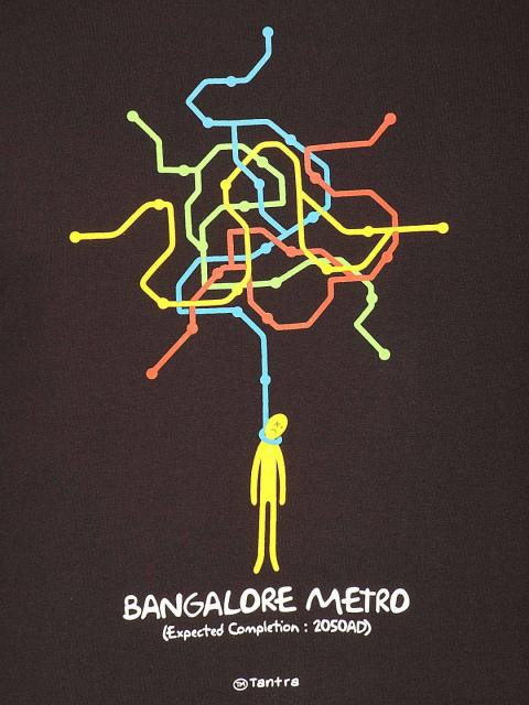 If your style spells cool, this black tantra tee belongs to your wardrobe! Poking fun at the Bangalore Metro Project, this t-shirt will show the world what you think of it. The bright graphic print stands out against a black background. Pair it with jeans and shorts to look uber cool.