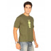 Green round neck short sleeved t-shirt made of 100% cotton, green fabric tape on the inseam of the neckline, vented hem, with a graphic print on the front
