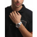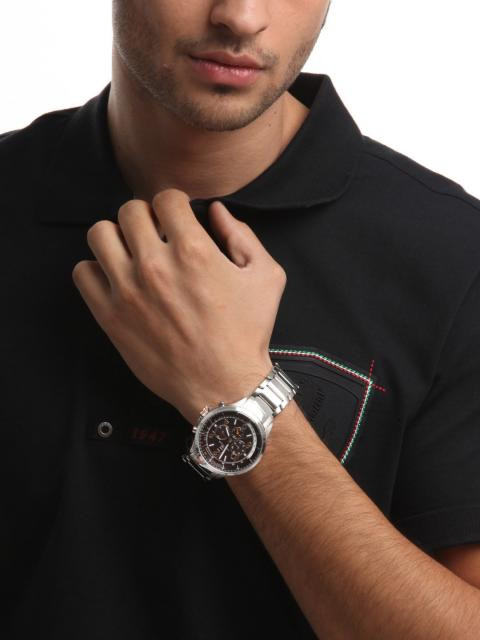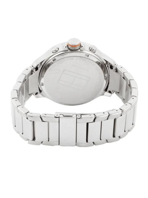 Case style: Analogue watch with a circular caseDial style: Black dialnbsp;Features: A screw to reset time, three-faced chronograph display, two push-buttons to adjust the featuresStrap style: Silver-toned metal bracelet-style strap secured with a butterfly claspWater-resistant up to 50 mComes in a signature Tommy Hilfiger caseWarranty: 2 years against manufacturing defects from the date of purchase