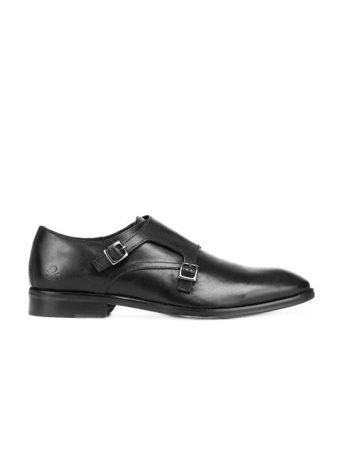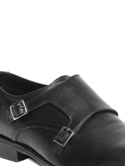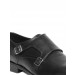 Round toed, casual slip-on in brown with a leather strap on the tongue that has a buckle closure
