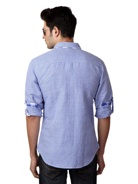 White and blue check shirt, has a spread collar, full buttoned placket, back yoke, long sleeves with buttoned cuffs, mid arm buttoned tab to fold the sleeves, patch pocket on the chest with slot seam, facings with larger check pattern and a curved hemline