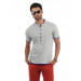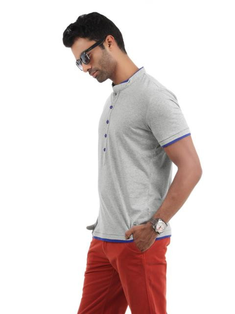 Grey melange Henley shirt, knit, band collar with an inner blue collar, short sleeves with blue profile stitch, 5 button placket in front, blue piping at sleeve and bottom hem, branding at hem
