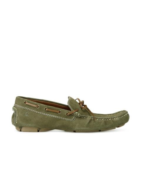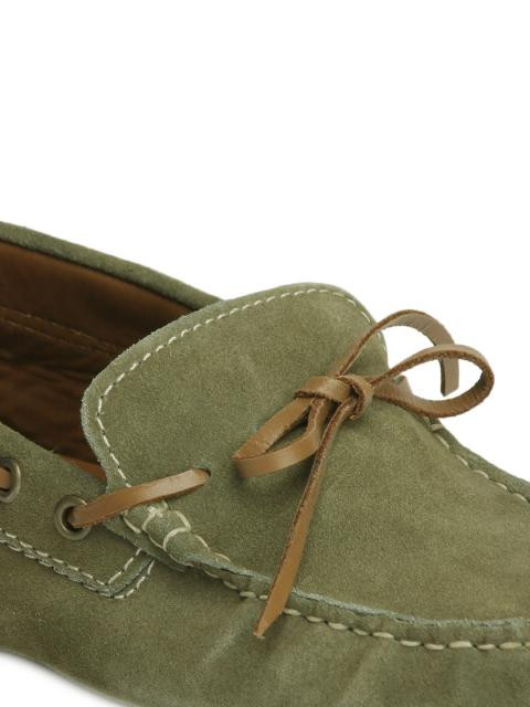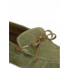 Square toed, casual slip-ons in green with tie-up detail on the tongue and stitch detail at the seams of the toe box