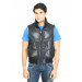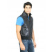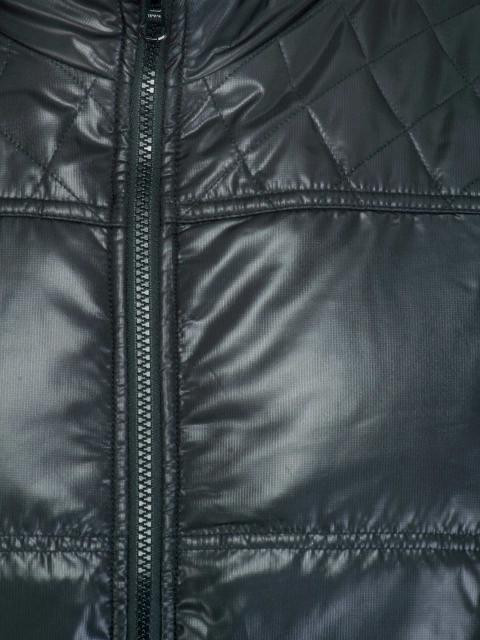 Black sleeveless puffer jacket with the shell and lining made of 100% polyester and trim fabric made of 97% polyester and 3% elastane, has a mock neck, zippered front placket, two pockets on either sides and a ribbed hem