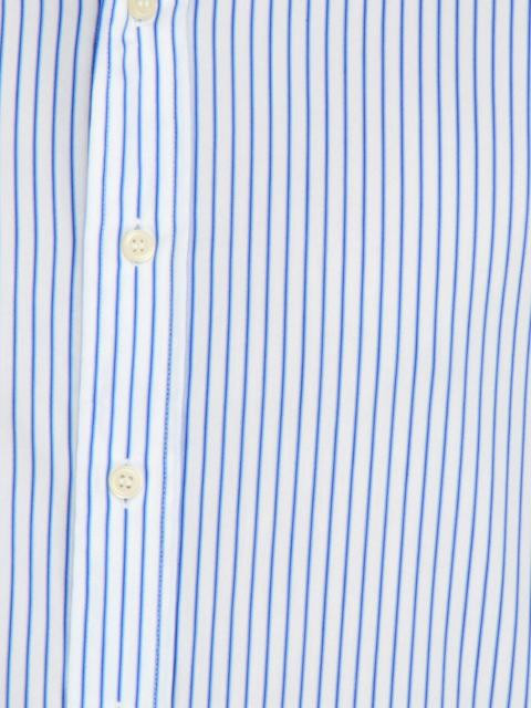 White shirt with blue toned stripes made of 97% cotton and 3% spandex, has full sleeves with double buttoned cuffs, spread collar with removable stiffeners, buttoned placket with pearlescent white buttons and a curved hem
