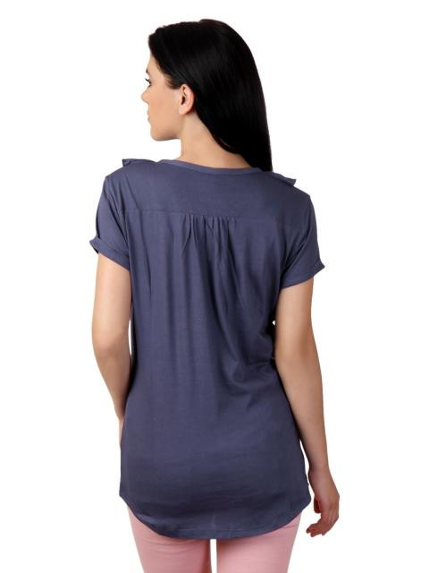 Knitted blue top with a full buttoned placket at the front, V neck with overlocked woven frills around the neck, short sleeves with upturned hem, yoke with gathers at the back