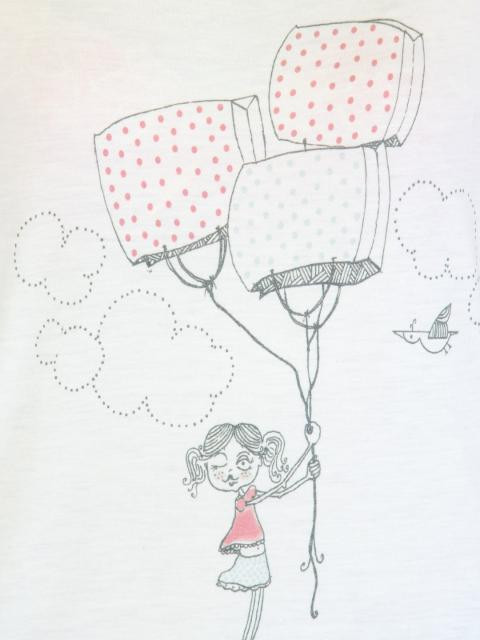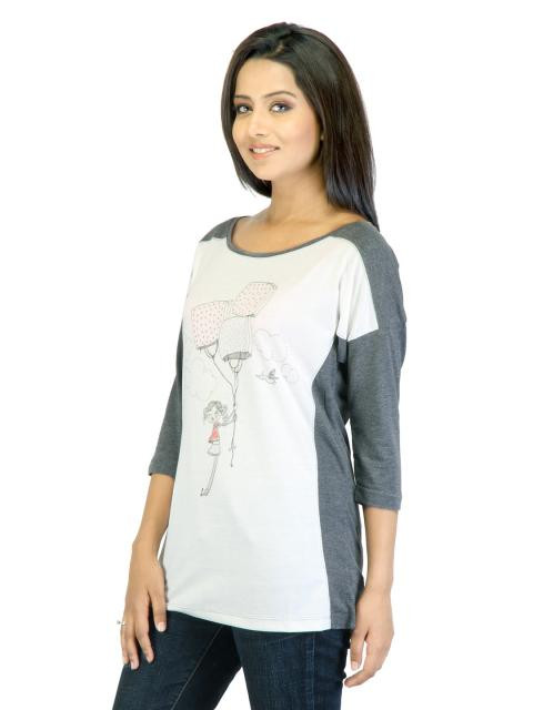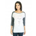 White and grey boat neck top made of 100% cotton, has three quarter length dolman sleeves and graphic print on the chest
