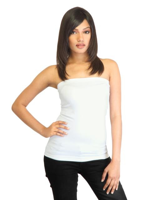 White tube top made of 92% polyamide and 8% elastane, and has a seamless feel