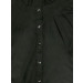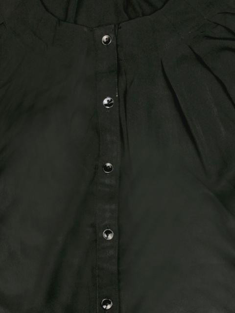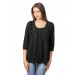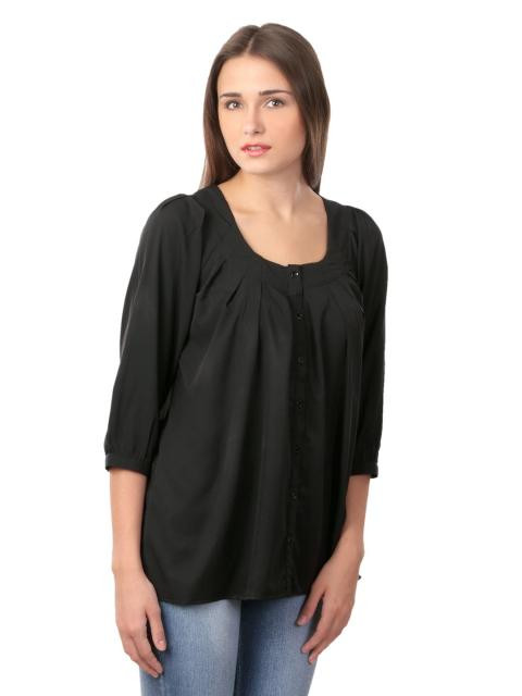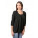 Black, scooped round neck top, with three quarter raglan sleeves, buttoned cuffs and a full buttoned placket