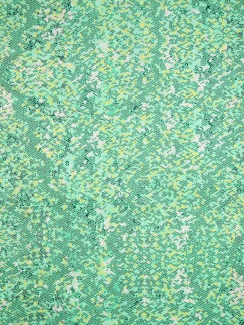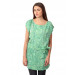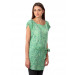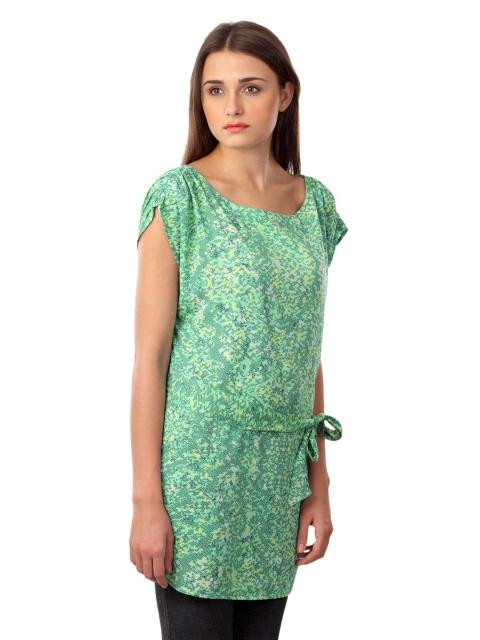 Green printed top, has a boat neck, short raglan sleeves that are pleated on the shoulders, sash with two loops on the sides and a curved hem with slit sides