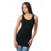 Black, long tank top, has a round neck, sleeveless with piping around the sleeves and neckline
