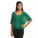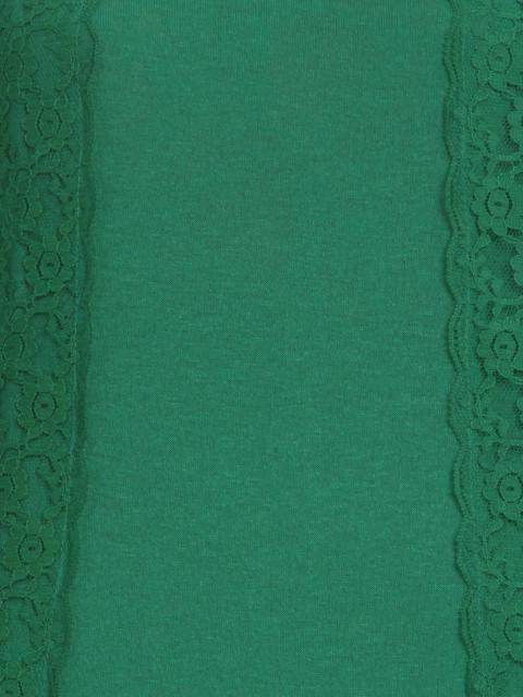 Green top that has a deep round neck, lace detail on top of the shoulders and along the length of the top, short sleeves, elasticated and smocked at the hem with an inner spaghetti strap top stitched to the top at the shoulders that is longer than the top