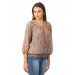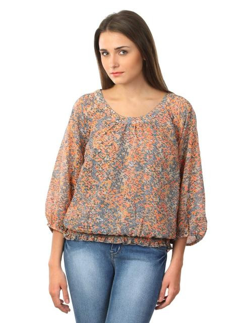 Grey, orange and black top, has a round neck, three quarter raglan sleeves with elasticated cuffs, slightly gathered from the neck down, elasticated and ruched at the hem