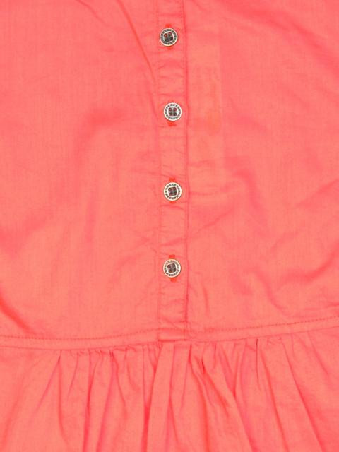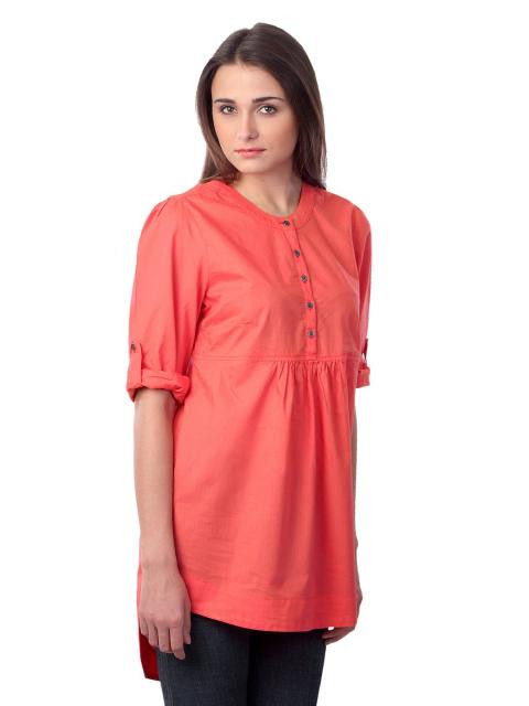 Red tunic, has a round neck, three quarter sleeves with a buttoned closure and a mid buttoned tab, buttoned chest placket, slightly gathered from the waist on the front, a box pleat at the back with a buttoned tab on the middle and a curved hem with the back a little longer than the front