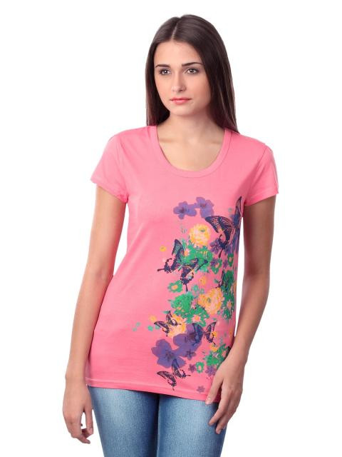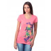 Pink top, has a round neck, short sleeves and graphic floral print on the left side