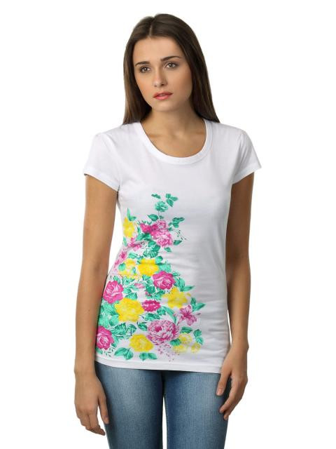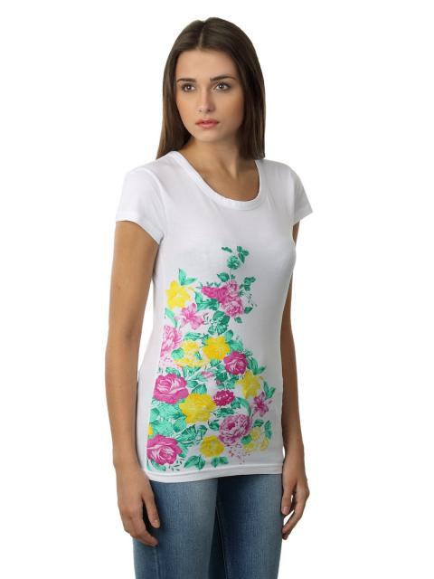 White top, has a round neck, short sleeves and graphic floral print on the right side