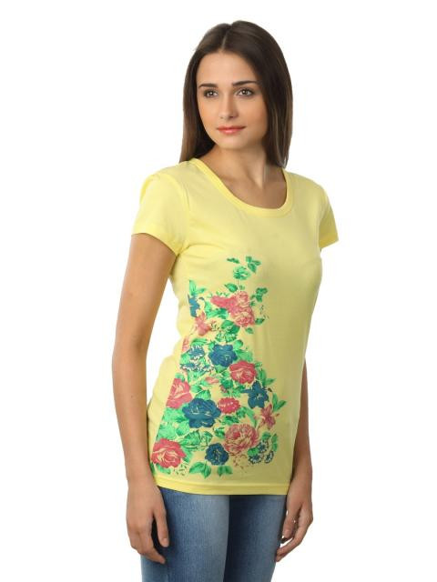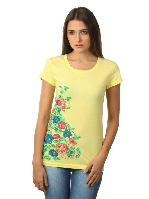 Yellow top, has a round neck, short sleeves and graphic floral print on the right side.