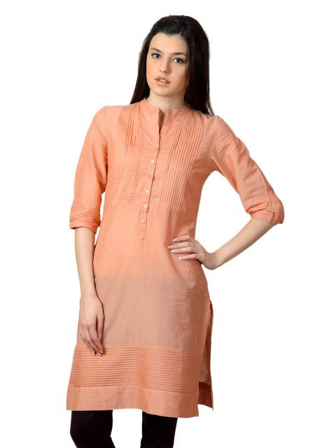 Orange kurta made of 100% cotton, has a mandarin collar with a split neckline, chest buttoned placket, has three fourth sleeves with pleats design on the cuffs, pleats on the front and above the hem and a vented hem